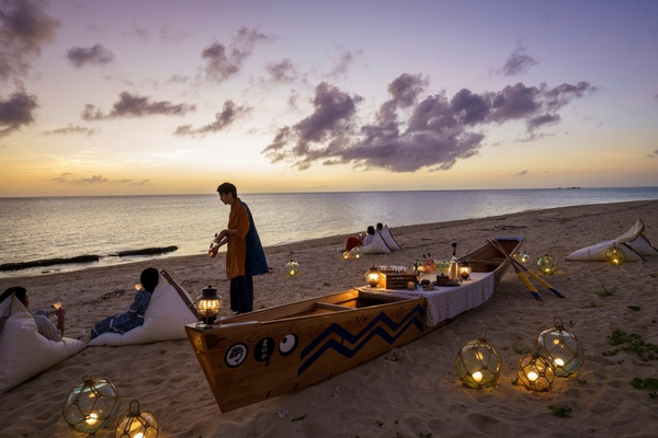 各施設が独創的なテーマで、圧倒的非日常を提供する「星のや」。沖縄県・読谷村にある滞在型リゾート「星のや沖縄」では、2022年5月15日~6月30日の間、西海岸に広がる美しい夕景を楽しむ「ハーリー」の季節限定の催し「浜辺のサバニ・アペリティフ」を開催します。ハーリーは、旧暦5月に行う航海の安全や豊漁を祈願する沖縄の行事です。サバニと呼ばれる伝統漁船で競漕が行われ、競漕の後には浜辺で酒を酌み交わす風習もあることから、星のや沖縄では浜辺に置かれたサバニを中心に食前酒・アペリティフを楽しむスペースが登場します。白砂の浜辺に腰かけて食前酒を楽しみながら、刻一刻と移り行く西海岸の美しい夕景を望めます。