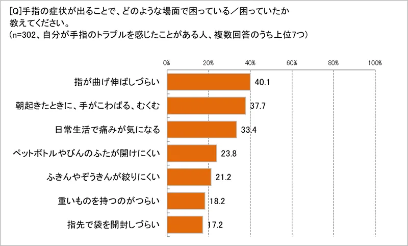 どんなときに症状を感じて困っているかを聞いたところ、「朝、起きるとしばらくは指がこわばっていて、動かしにくい」(50代前半・専業主婦)、「朝は指の第一関節がうまく動かない」(40代後半・フルタイム)など、寝起きに症状を感じるという意見が多く挙がりました。また、「物をつかんだり持ったりすると痛い」(50代前半・専業主婦)、「グー、パーすると痛い」(40代前半・専業主婦)など、痛みに悩んでいる人も多数。さらに、「最初かるい痛みがあり、気づいたら変形していた」(50代前半・フルタイム)、「薬指の第一関節が曲がった」(40代後半・パート)など、見た目の変化が起こるケースも。ほかにも、「ペットボトルのふたが開けにくい」「ふきんや雑巾が絞りにくい」「重いものを持つのがつらい」「指先で袋を開封しづらい」など、日常生活のさまざまな場面で手指のトラブルに困っていることがわかりました。