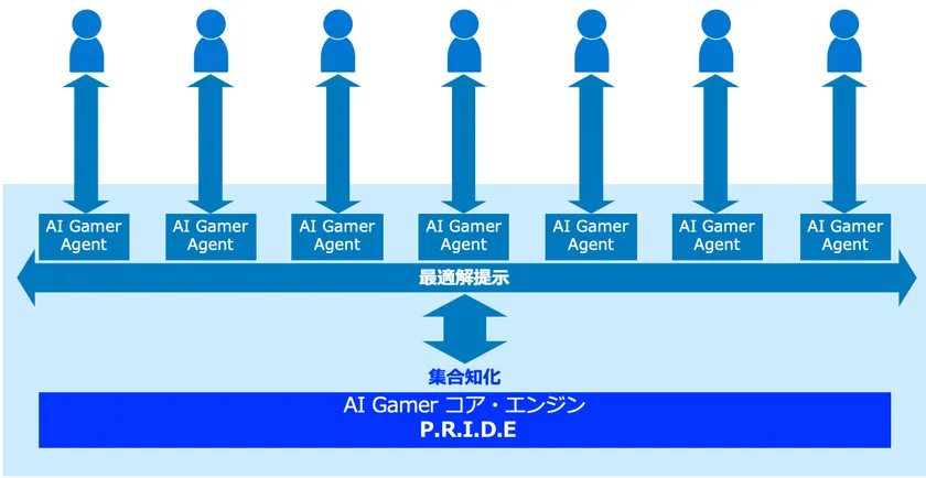 当社は、今回のプロトタイプ展示に先立ち、自社のAI Gamerを軸とするサービスモデルの実現方式に関して、米国での特許申請を済ませております。これは、コンシューマ提供サービスとなるAI Gamer Agentが、個々のユーザーの特性に合わせてデータ学習を行い個性的に進化する一方で、AI Gamerのコアエンジンが集合知化するものとなります。