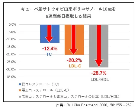 キューバ産ポリコサノールは約120編のSCI級論文を通じて、その機能性と安全性が確立されています。キューバ国立科学研究所で行われた人臨床試験で健常者を対象に8週間キューバ産ポリコサノールを毎日10mgずつ摂取した結果、総コレステロール(TC)が12.4%減少し、悪玉コレステロール(LDL-C)の数値が20.2%減少し、心血管疾患の重要な予測因子であるLDLとHDLの比率は28.7%改善しました。