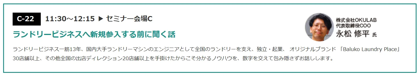 会期中、2019年9月19日(木)11:30~ 会場内[セミナー会場C]にて、当社代表 永松 修平がプレゼンテーションを行います。事前申し込みは不要です。直接会場へお越しください。