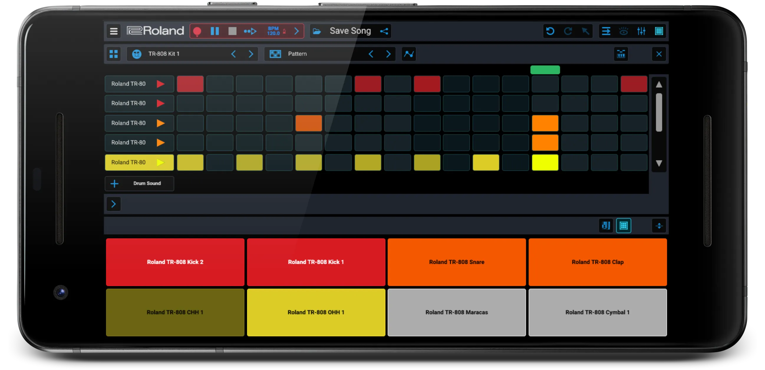 リズムマシン「TR-808」の配色にカスタマイズした「リズム・エディター」画面