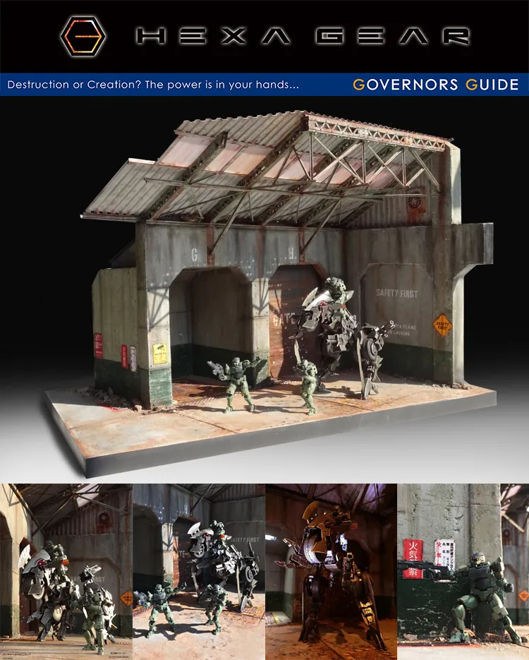 情景師アラーキー氏が制作した1/24スケールの緻密な廃工場ジオラマを舞台に自分のヘキサギアを展示して撮影することができます。