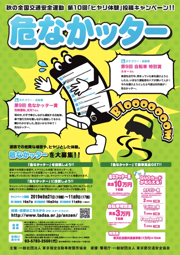 一般社団法人 東京指定自動車教習所協会(本部:東京都品川区、以下 東京指定自動車教習所協会)は、警視庁、一般財団法人 東京都交通安全協会の後援を受け、「秋の全国交通安全運動」の一環として道路での危険な場面やヒヤリとした体験を投稿・投票する“秋の全国交通安全運動 第10回「ヒヤリ体験」投稿キャンペーン!!『危なかッター』”を、2019年9月21日(土)から開始いたしました。