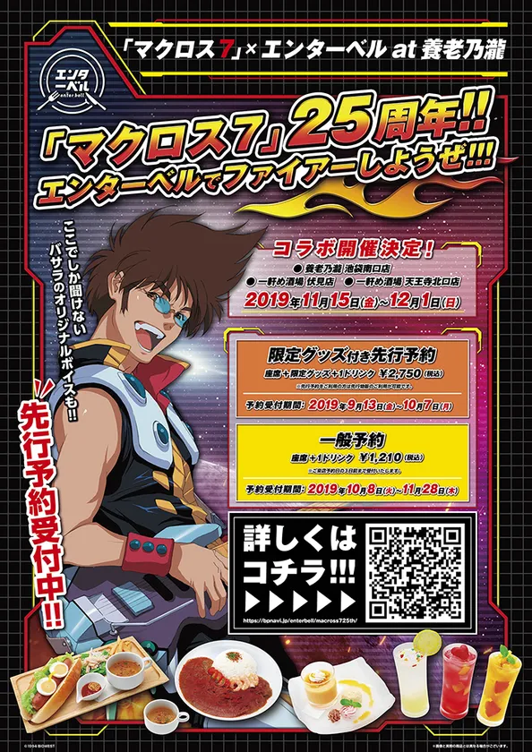 株式会社BANDAI SPIRITS フードエンターテインメント開発部は、既存の飲食店でキャラクター飲食コラボが楽しめる「エンターベル」と今年25周年を迎えるテレビアニメ『マクロス7』とのコラボレーション企画『マクロス7 × エンターベル at 養老乃瀧』を、池袋、名古屋、天王寺の全国3店舗にて2019年11月15日(金)より実施いたします。(企画元:株式会社BANDAI SPIRITS)