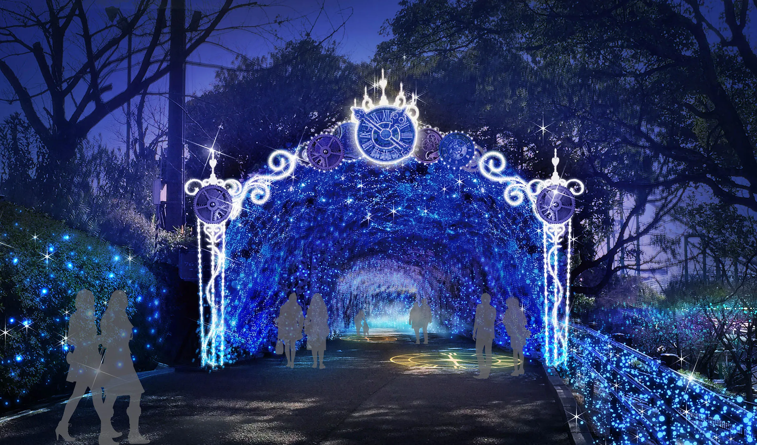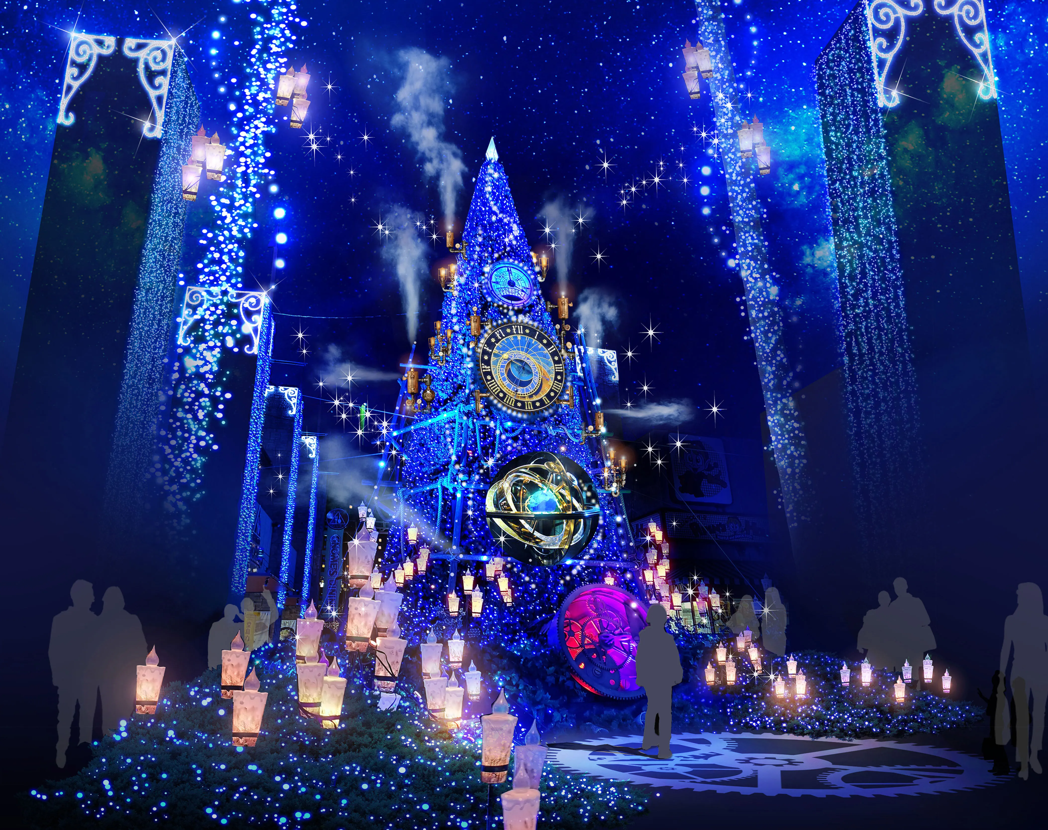 昨年に引き続き「タイムトラベル」をテーマに、“時計の精”に誘われながら「タイムトラベルファンタジーストリート」「ランタンカーニバル広場」「光の花園」「タイムトラベルトンネル」のイルミネーションエリアで、演出の異なる4つの光の世界が堪能できます。中でも、メインエリアの「タイムトラベルファンタジーストリート」では、100年以上前から動き続ける不思議な古時計の「Time Travel Tree」に、新たに羅針盤が加わり、世界中の空間と時間を巡る不思議なプログラムショーを繰り広げます。