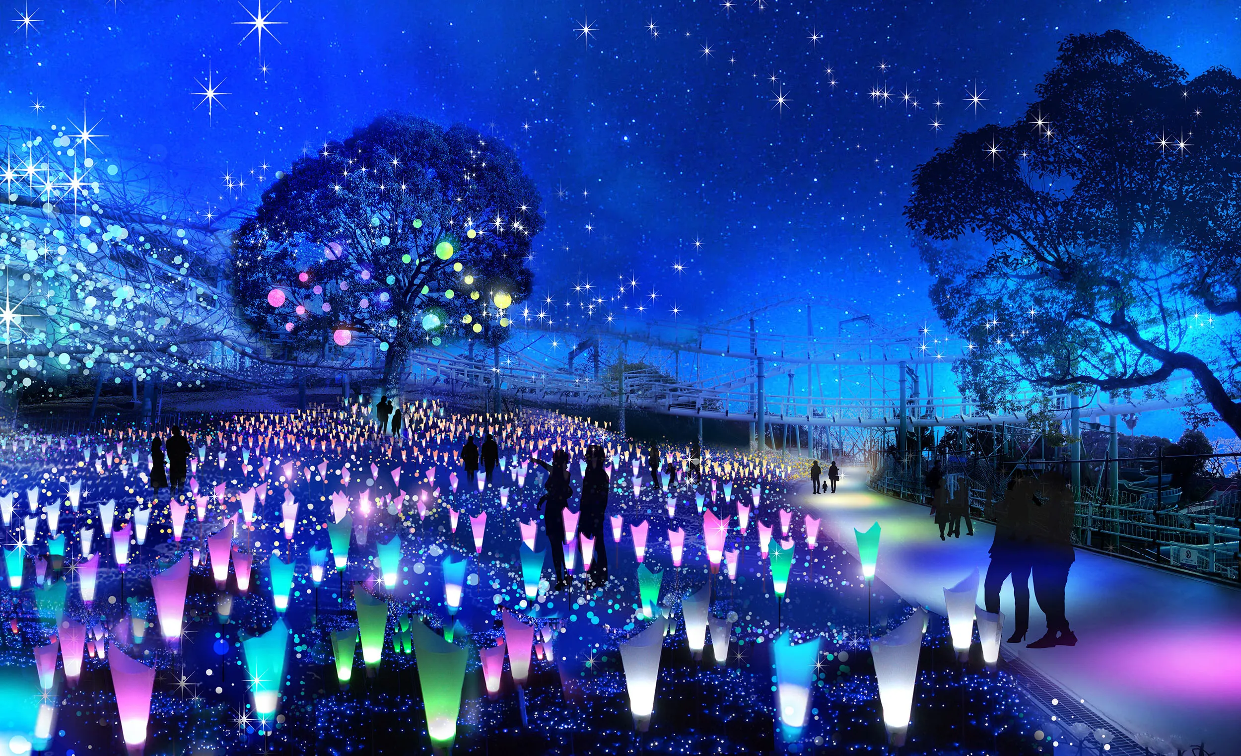 | 光の花園 丘陵地を色とりどりの光の花々が覆い、遊歩道を歩きながら光を感じられるエリア。まるでミュージカルの世界に入り込んだような壮大な光のショーに注目です。 今年はフルカラーの光に包まれたシンボルツリーも加わり、花々に囲まれるフォトスポットとして魅力満載です。 |
