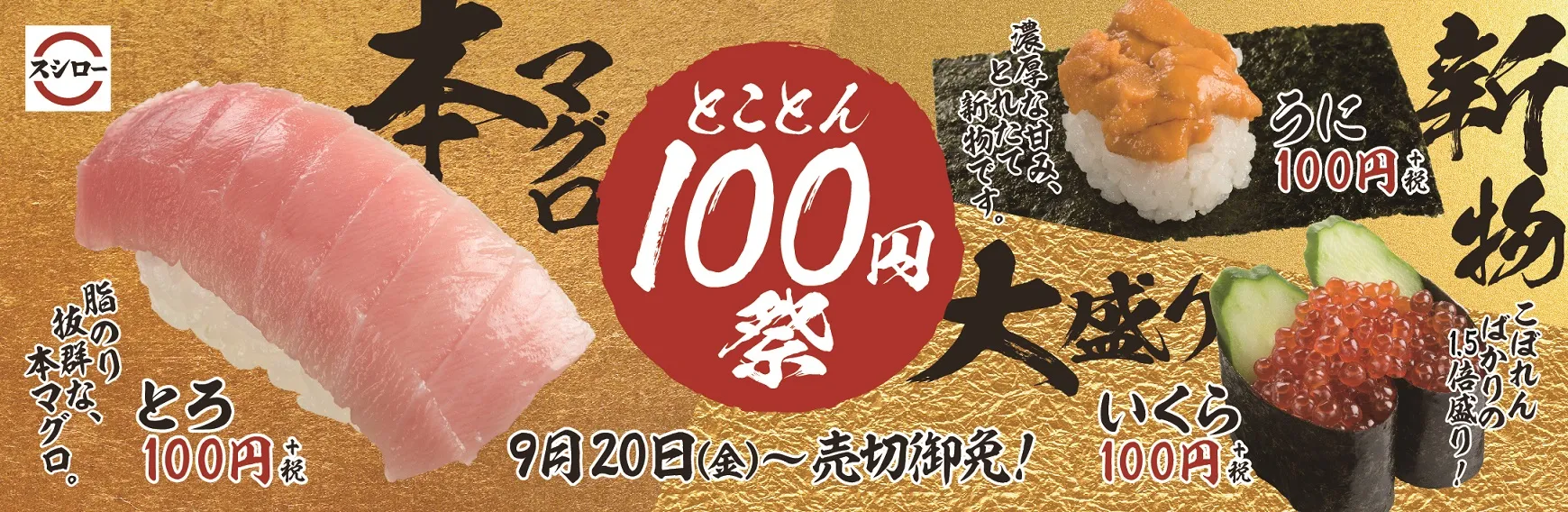 いよいよ到来する食欲の秋に、ぜひスシローにお越しいただき、贅沢な味わいのネタをお得にお召し上がりいただける『とことん100円祭』をお楽しみください。