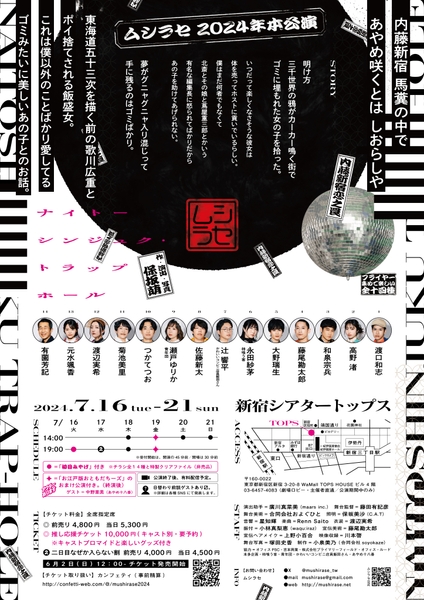 ムシラセ主催、『ナイトーシンジュク・トラップホール』が2024年7月16日 (火) 〜 2024年7月21日 (日)に新宿シアタートップス(東京都 新宿区 新宿 3丁目20-8 TOPS HOUSE 4F)にて上演されます。