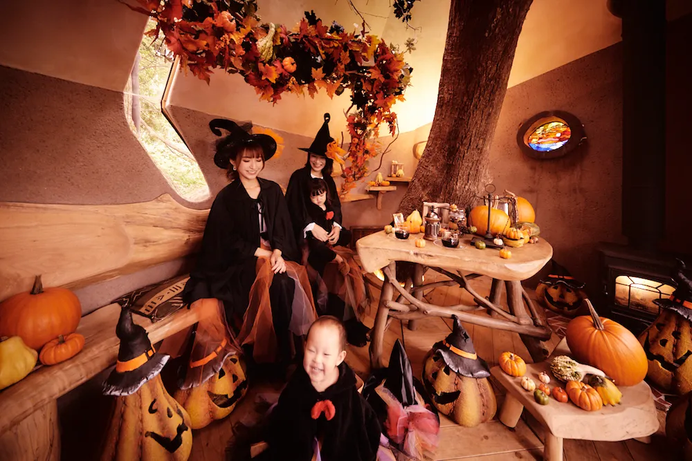 樹齢300年の楠に佇むツリーハウスが、ハロウィン期間中「魔女の家」をイメージした空間になります。空を飛ぶためのほうき、とんがり帽子、薬草を量る天秤や洋書など、まるで魔女の家に遊びに来たかのような気持ちになれるアイテムがハウス内に並びます。魔女の仮装をして写真撮影はもちろん、貸切のティータイムを楽しむのもおすすめです。