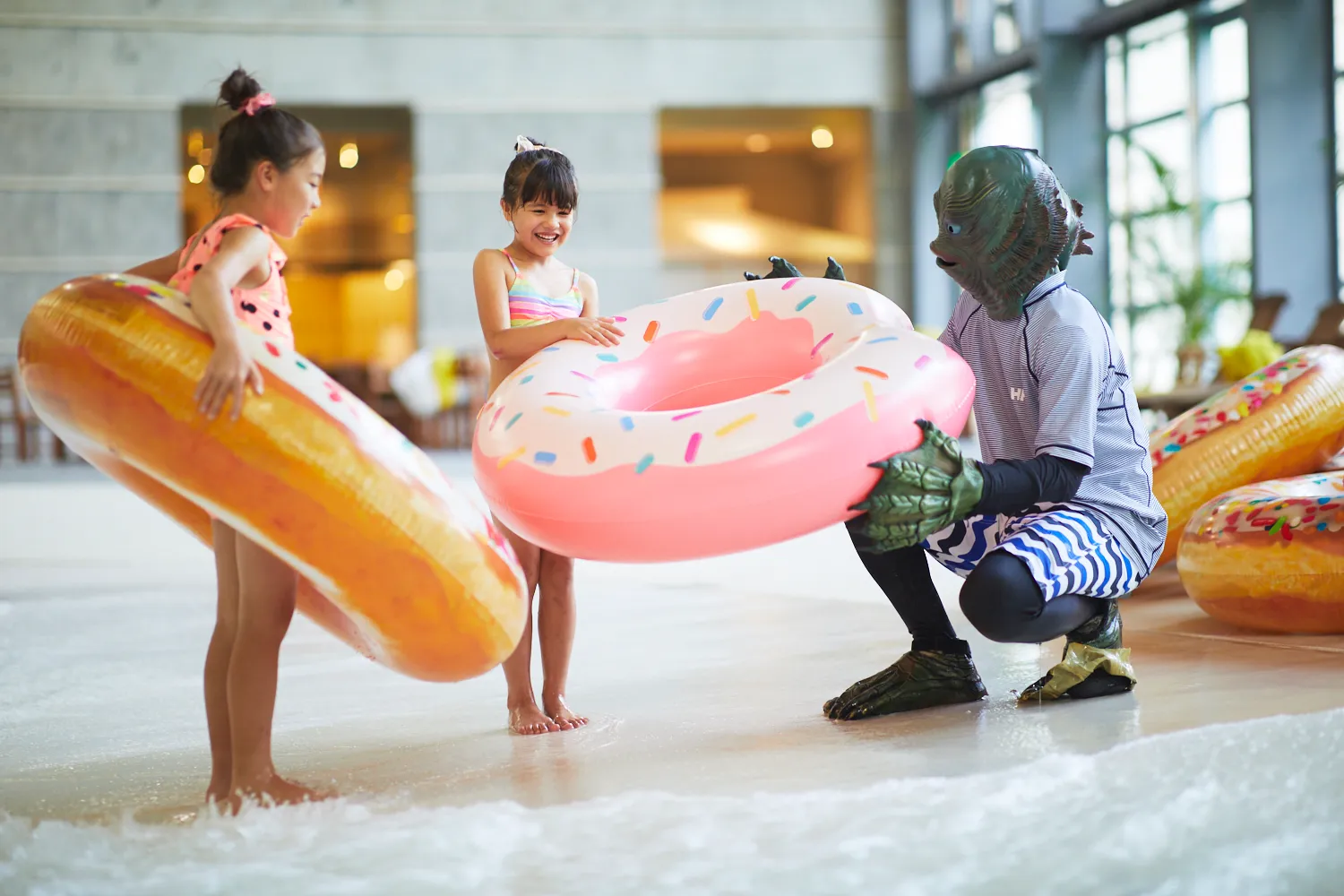 屋内プール「イルマーレ」に「気まぐれ半魚人」が登場します。この気まぐれ半魚人への合言葉は「トリック・オア・トリート」です。気まぐれ半魚人がお客様からこの合言葉を聞くと、フロートを貸し出します。ドーナツやキャンディーなどの形をしているフォトジェニックなフロートです。さらに、ヨーロッパの街並みを感じるホテル全てがフォトスポットとなり、働くモンスターたちは気さくに記念撮影に応じます。