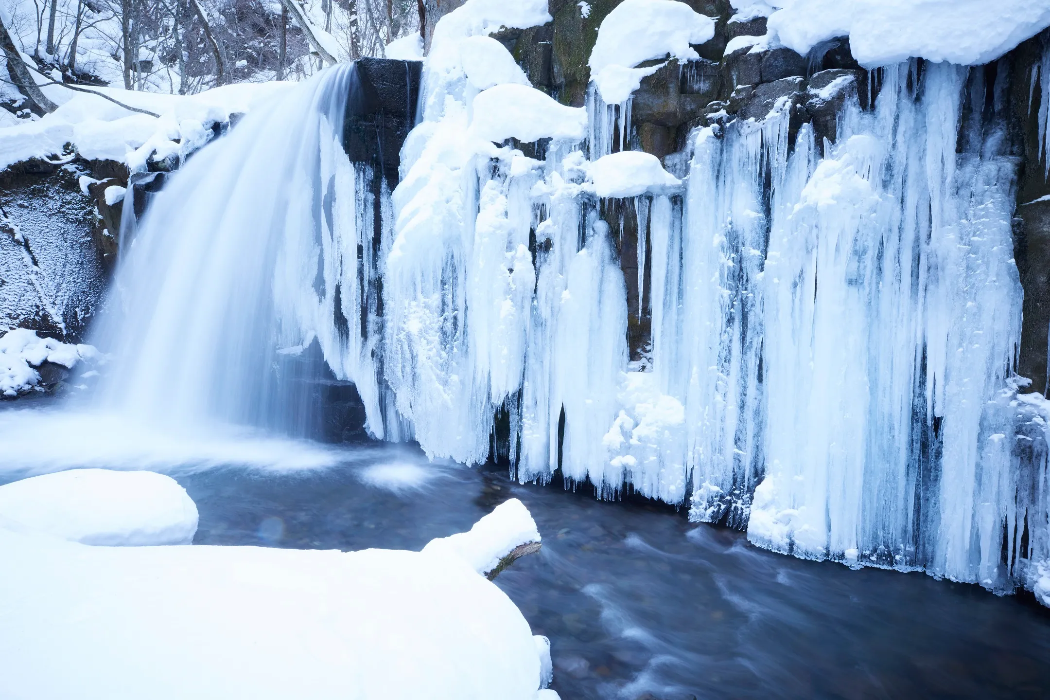 ▲奥入瀬渓流で一番大きな滝「銚子大滝(ちょうしおおたき)」(2月中旬撮影)