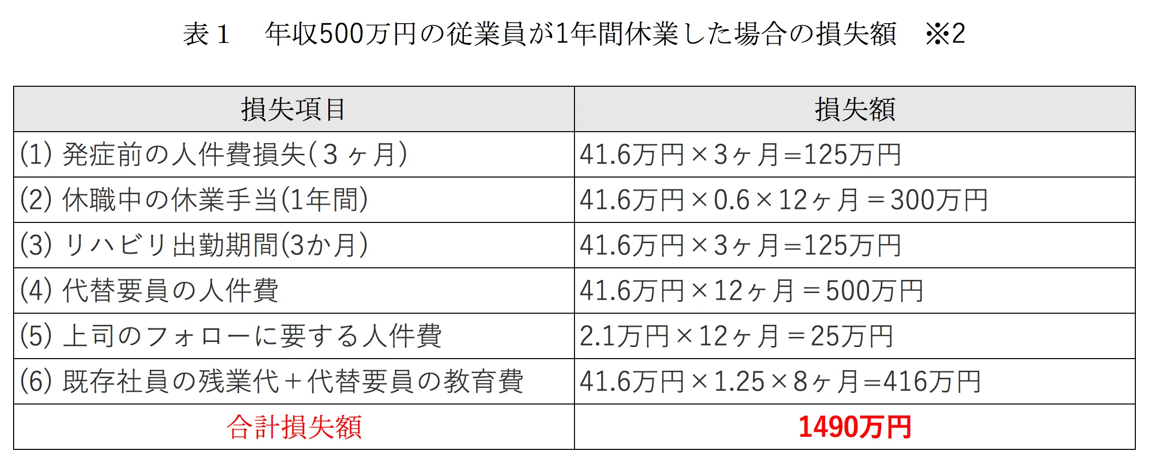 従業員ひとりが1年間メンタル疾患で休むと損失は年収の約3倍