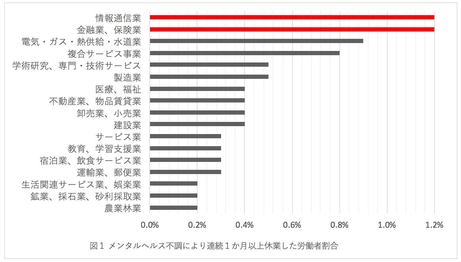 厚生労働省 平成29年の労働安全衛生調査※3によると、図1の通りメンタルヘルス不調により休職する割合は全体で0.4%、業種別では情報通信業や金融業が1.2%と非常に高くなっています。