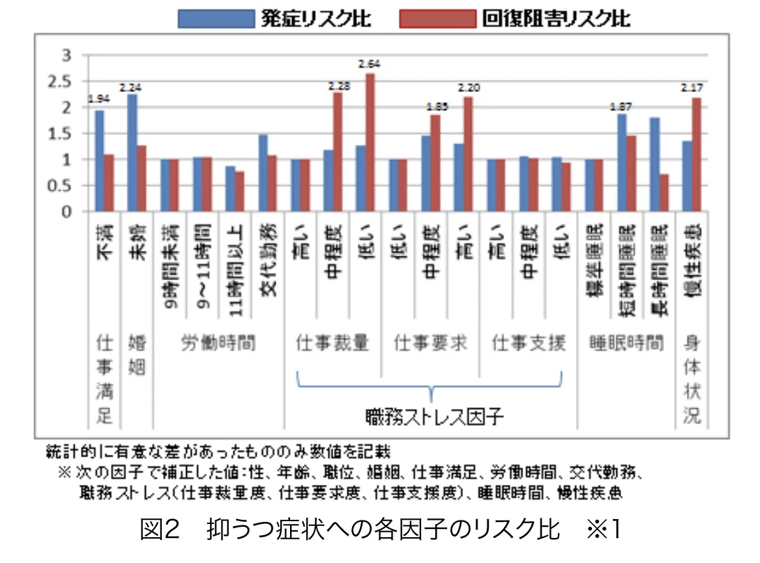 もちろん、図2の通り、仕事満足度がうつ発症に大きく影響するため、デスクワーク姿勢の改善だけで問題解決するとは言い切れません。従業員自ら、仕事を変更することは困難ですが、座る姿勢を変え、体の負担を減らすことは可能です。