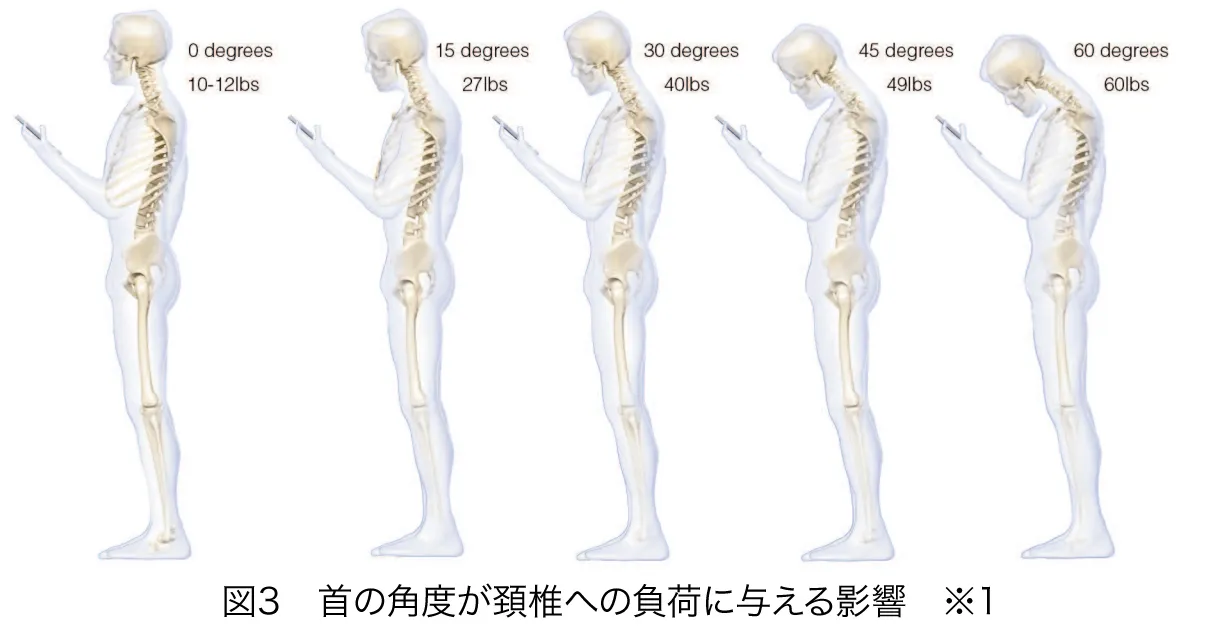米ニューヨーク市の脊椎専門のクリニックの外科医長を務めるケネス ハンスラージ氏によると首が前に傾くほど頚椎にかかる負荷は増え、図3のようにもっとも姿勢が悪いと27kg(60lbs)になると解明しています※6。つまり、前述の座位時間の長さとは別に、デスクワーク姿勢の悪さが体への負担を増していることがわかります。