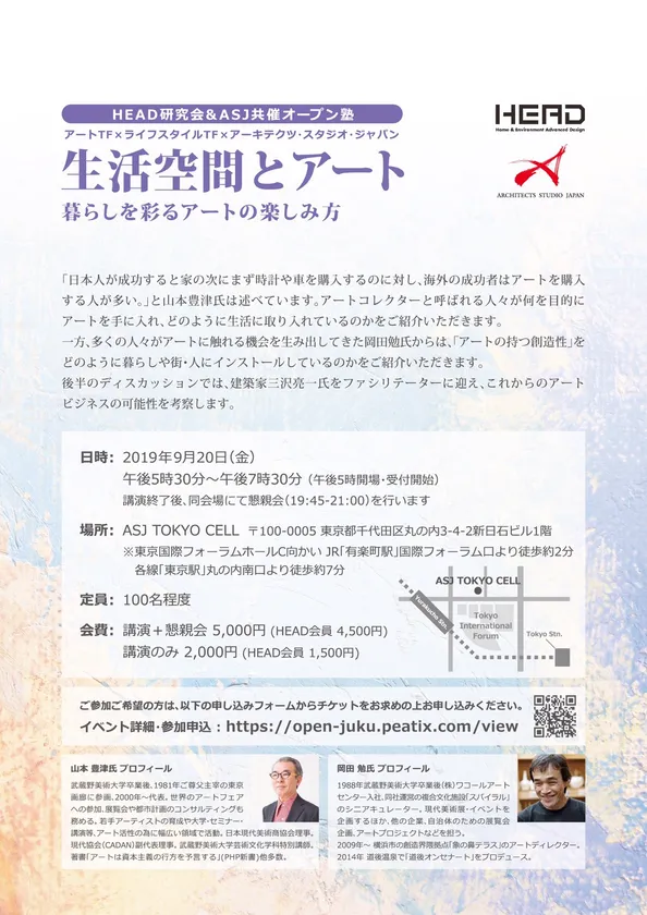 HEAD研究会のTF(タスクフォース)であるライフスタイルTFとアートTFが共催にて、生活空間とアートをテーマにしたオープン塾を、2019年9月20日(金) ASJ TOKYO CELLにて開催いたします。