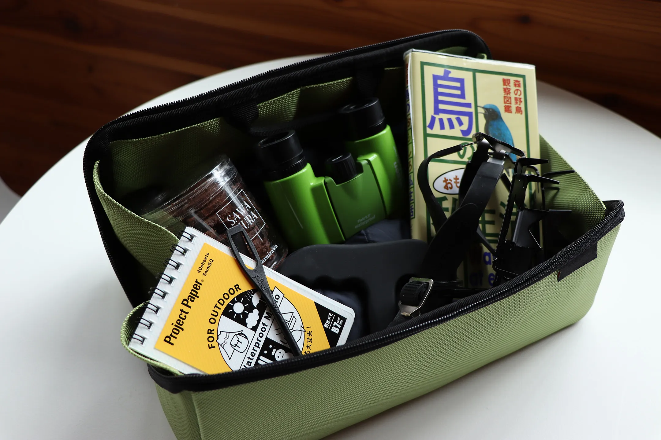 双眼鏡、野鳥図鑑「鳥のおもしろ私生活」、アイゼン、チョコラスク)