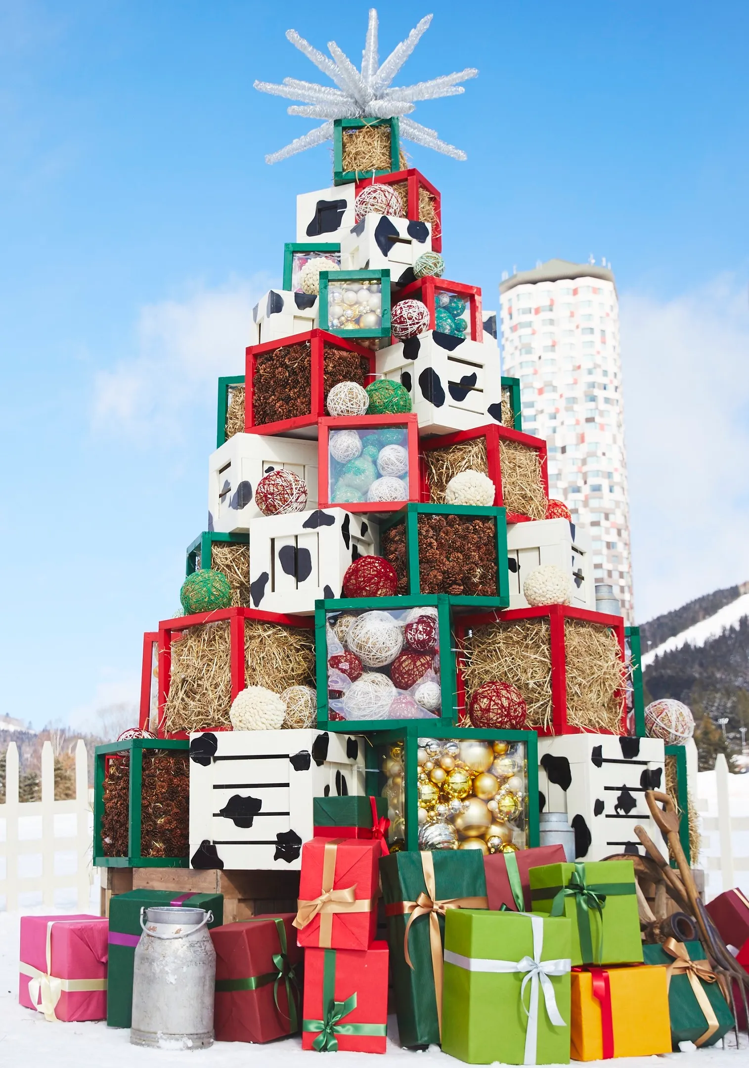 リーです。当ホテル「ザ・タワー」の中庭「ウェルカムコート」内に、柵で囲った敷地の中心に牧草ツリーを設置します。牧草を木枠に詰めた「牧草キューブ」や今回新しく追加した、牛柄の木箱を積み重ねて作りました。装飾には、牧草を丸め外側を