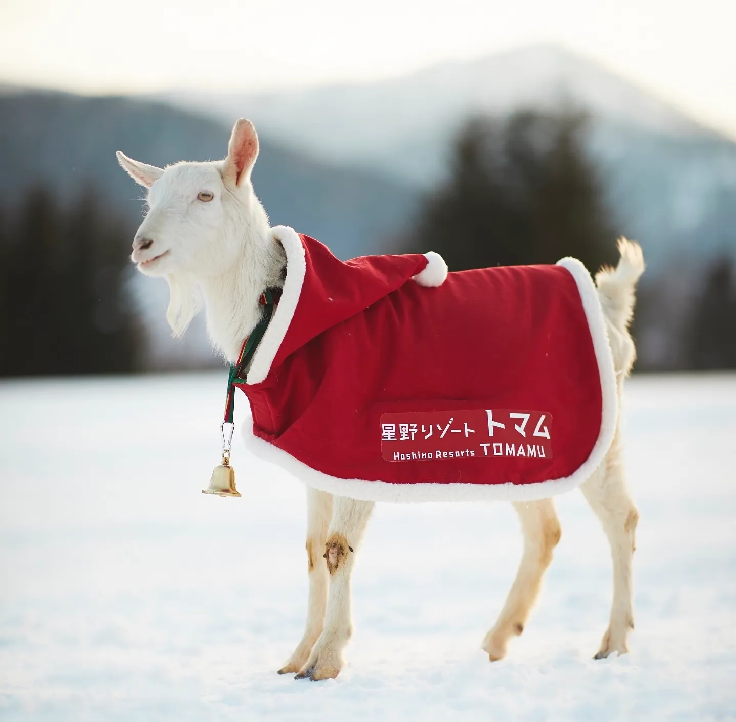 牧草ツリーの周りに、トナカイと合計約5頭のヤギや羊がいる空間全体が「クリスマスミニファーム」です。ここにいるヤギや羊はサンタの衣装を着て、雪と戯れて過ごしています。ツリーの周りを動物たちが動き回る姿は、当リゾートでしか見られません。牧草の香りに包まれた素朴で温かみのある空間で、動物たちを眺めることができます。