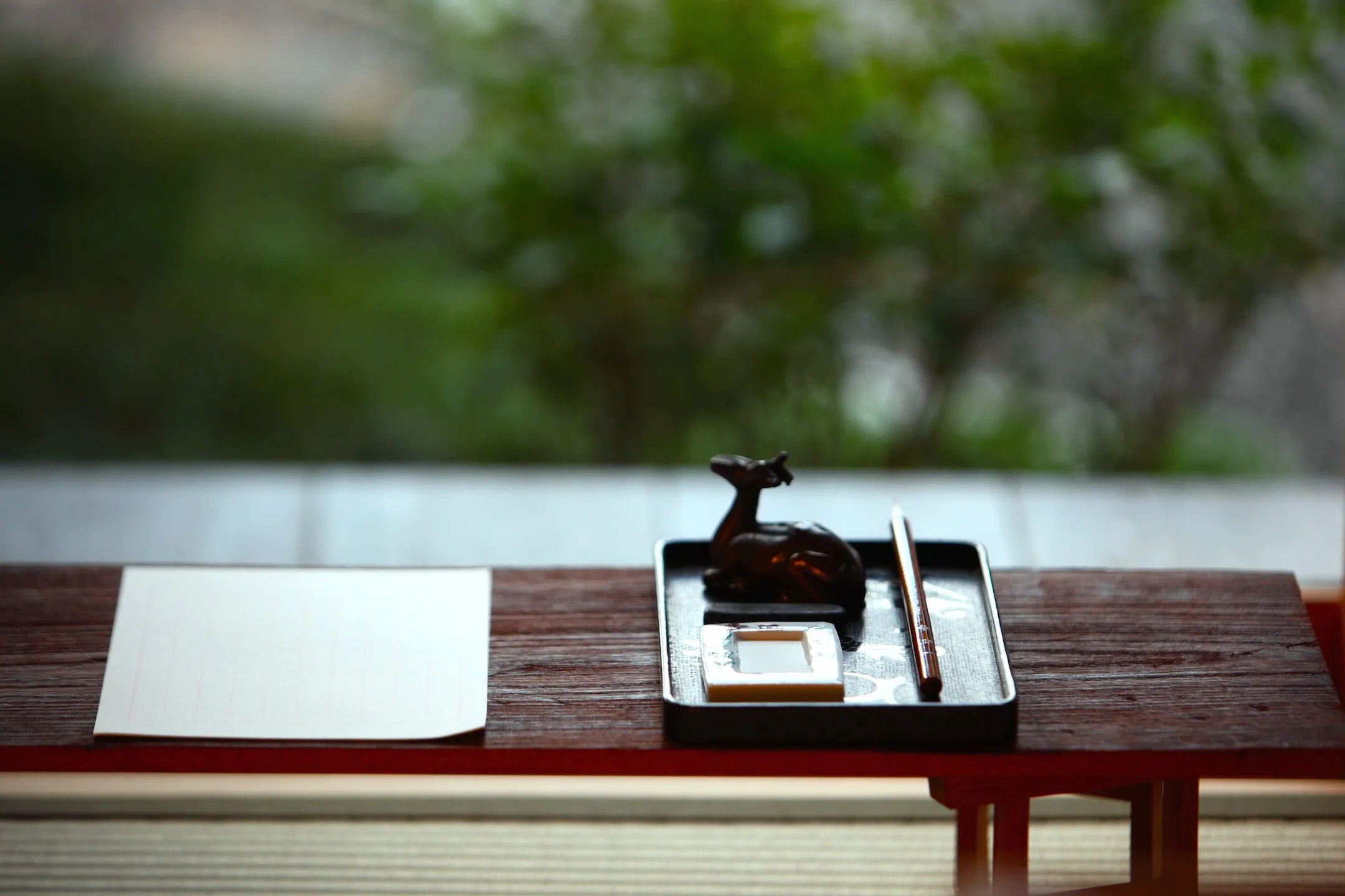 チェックイン後、星のや京都にて書道家の指導の下、書の練習を行います。そのため、日ごろ筆を持つ機会の少ない人でも、安心して清水寺での本番を迎えることができます。墨をすりながら心を落ち着かせることからはじめ、筆の持ち方や姿勢などを習ったあとは、基本の「止め」や「払い」を練習します。その後、好きな文字の練習を行います。雑念を払い一筆一筆に集中して字と向き合う時間を過ごします。