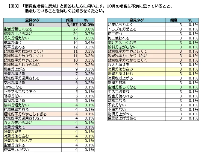増税に関して反対と回答した方に理由を伺ったところ、「出費/支出が増える」、「収入が増えない、生活が苦しい」、「消費が落ち込む」、「軽減税率が分かりにくい」などの不満や懸念の声が抽出されました。具体的なコメントも紹介します。