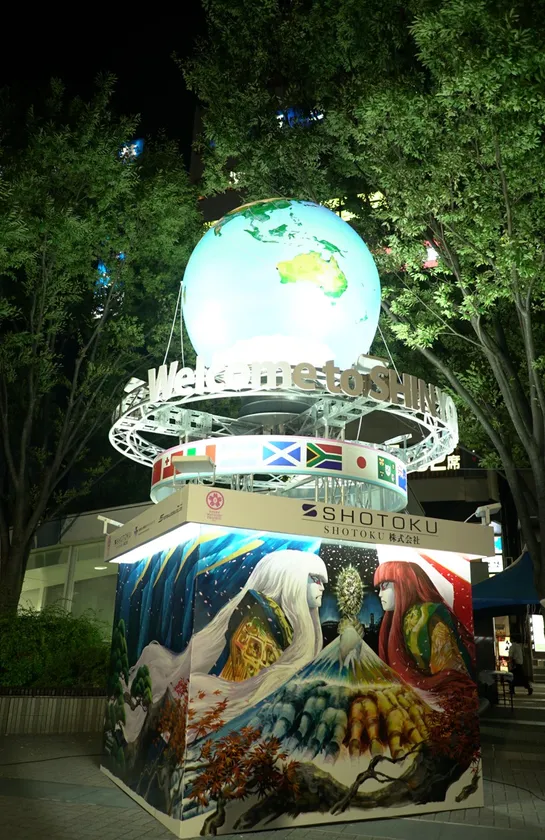 地球儀の下には【Welcome to SHINYOKOHAMA】のサインやさらにその下部には万国旗が施され、新横浜の【お・も・て・な・し】の心がデザインされています。台座には横浜出身のイラストレーター、ペインターでもあるKensuke Takahashiさんが『新横浜パフォーマンス2019』の開催期間に「ノーサイド」をテーマにライブペイントをおこない作品が完成しました。