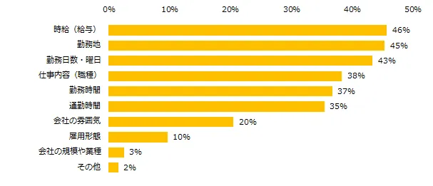 「仕事を探す際に、妥協できない条件は何ですか?」と伺うと、トップ3は「時給(給与)」(46%)、「勤務地」(45%)、「勤務日数・曜日」(43%)でした。各項目の妥協できない理由も紹介します。