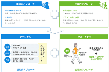 認知症予防には、適度な運動とバランスの良い食事で脳の健康状態を良好に保つ【生理的アプローチ】と、趣味やボランティア活動などで社会と接触し脳を刺激する【認知的アプローチ】を、双方バランスよく取り組むことが効果的と考えられています。