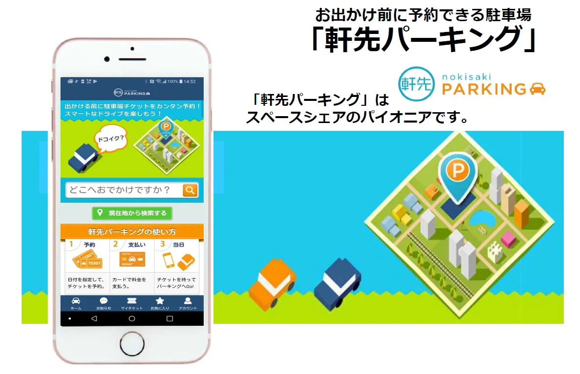 シェアサービスのパイオニアである軒先は、「軒先パーキング」を通じて、自宅の駐車場やアパート・マンションの空き駐車場、月極駐車場などの空き駐車場を貸したい方と、イベント・観光・ショッピングなどの利用を目的に駐車場を使いたい方をマッチングするインターネットサービスを展開しています。