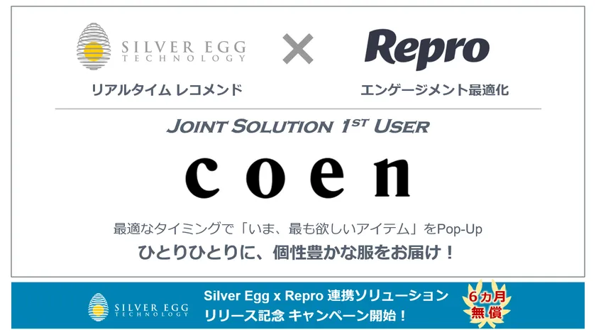シルバーエッグ・テクノロジー株式会社(本社:大阪府吹田市、代表取締役社長&CEO:トーマス・フォーリー、東証マザーズ:3961、以下 シルバーエッグ社)は、2019年9月20日、同社が開発・提供するAI(人工知能)技術を用いたレコメンドサービス「アイジェント・レコメンダー」と、Repro(リプロ)株式会社(以下 Repro社)の提供するCE(Customer Engagement)Platform Reproとの連携ソリューションを、アパレルブランド「coen」のECサイトに導入しました。また、本連携ソリューションの提供開始を記念して、シルバーエッグ社の提供するRepro連携オプションのサービス価格を半年間無償とするキャンペーンを本日より開始します。