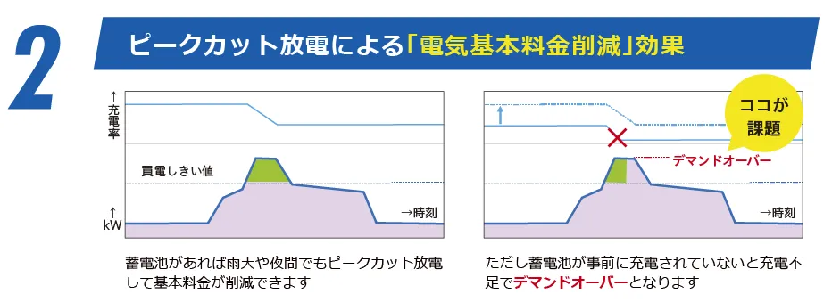 理想的な蓄電池併設型自家消費システムですが、蓄電池の「力」を最大化することが出来ない課題がありました。「余剰活用」は事前に放電されていないとフル充電となり発電制限となる一方、事前に充電されていないと「ピークカット」はデマンドオーバー、「非常用電源」は短時間しか電源供給できない相反する前提が存在します。余剰電力は変動するため「余剰活用」に蓄電池の大部分を割り当てると、「ピークカット」「非常用電源」に使用できる蓄電池が減り効果が制限されてしまいます。