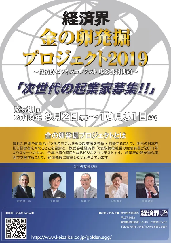 月刊ビジネス誌『経済界』を発行する株式会社経済界(本社:東京都港区、代表取締役社長:佐藤 有美)は、明日の日本を担う起業家を発掘・応援するビジネスコンテスト「金の卵発掘プロジェクト2019」の募集を開始いたしました。