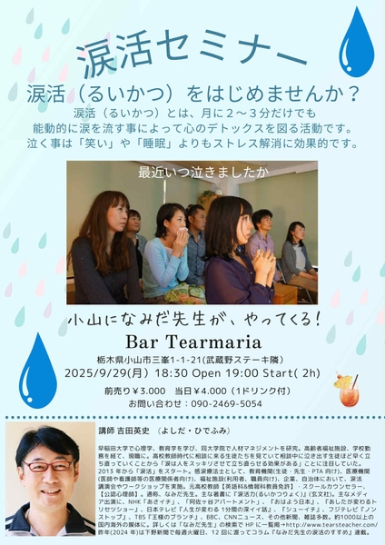 通称「なみだ先生」として、企業・自治体・教育機関・医療機関・福祉施設向けの「涙活」講演などを手がけている、感涙療法士の吉田英史は、2025年9月29日(月)に、栃木県小山市のBar Tearmariaで「涙活(るいかつ)」セミナーを実施します。涙の効能やストレス解消法の講義、泣ける映像の視聴を通じて、参加者に涙活を体験してもらい、泣きやすい体質づくりを目指します。