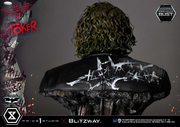 本作の見どころは、映画『THE DARK KNIGHT』のイメージが投影された胸部の表現。胸元から肩・胸部にかけて劇中同様精密に造形されながらも、その部分を漆黒にペイント。あたかもキャンバスに見立て、“HAHAHA…”の文字やバットマークなどの鬼気迫るジョーカーの殴り書きが描かれた様はさながら存在感あふれるアートのような佇まいに。既存のバストモデルとは一線を画す、“芸術作品”を思わせるアプローチの商品になっています。