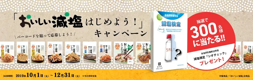 キャンペーンにご応募いただいた方の中から抽選で300名様に、一日あたりの推定食塩摂取量がチェックできる減塩検定「シオチェック」が当たります。