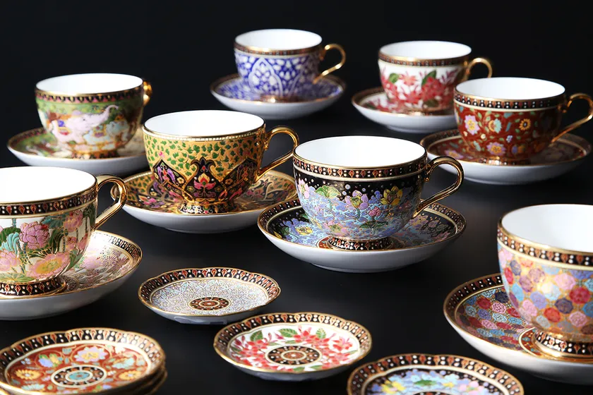 今回、ブランベンジャロンに数百以上ある図柄を収めたパターンブックの中から、テーブルウェアのエキスパートであるル・ノーブルの販売スタッフが日本の食卓に合う器をテーマに厳選した9柄で、ティーカップ&ソーサーとミニプレート 8cmを制作いたしました。日常生活で活躍するカップ&ソーサーはもちろん、ミニプレートはお手頃価格ですので初めてお使いいただくベンジャロン焼におすすめです。タイ王室御用達テーブルウェアの最初のコレクションとしてお楽しみください。