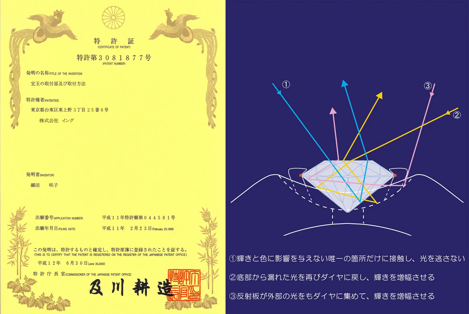 イングは、ダイヤモンドの光学的な特徴に着目し、ダイヤモンドが最も美しく輝く留め方の技法を開発し、特許を取得していました。