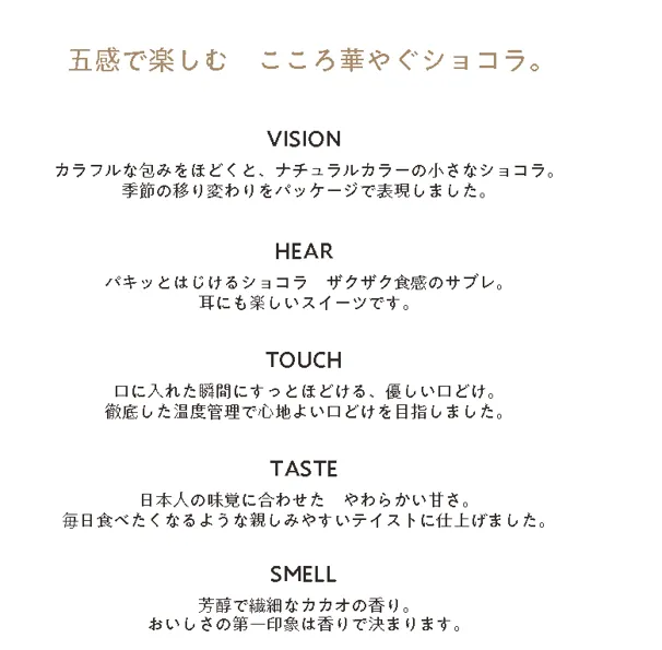 「le pepin(ル ペパン)」のコンセプトは「五感で楽しむこころ華やぐショコラ」。フラワーショップからインスパイアを受け、花が生み出す彩りのあるくらし、豊かで幸せな時間を、おいしいショコラを通じてお届けしたいという想いから誕生しました。
