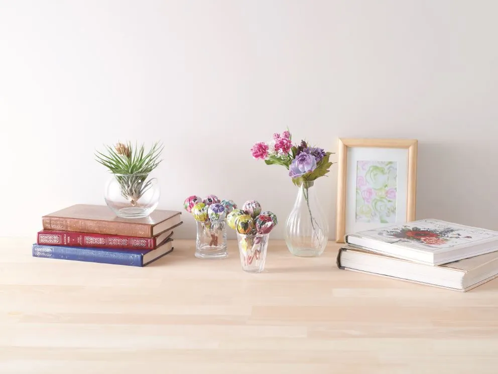 自家製ナッツペーストを抹茶・ミルク・ストロベリーチョコでコーティングした、ロリポップ型チョコレート。ナッツは食感と香ばしい風味を楽しめるよう粗挽きに。ボンボンを1輪の花に見立て、四季を感じさせる花柄を描きました。
