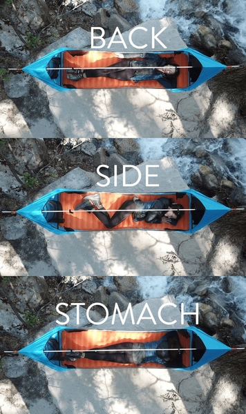 従来のハンモックのように腰が沈まないので、仰向け、横向き、うつ伏せなどお好きな姿勢で寝ることができます。