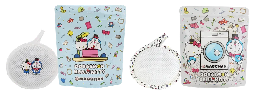 この度、ポンと入れて楽な洗たくを実現している「洗たくマグちゃん」に、目でみて楽しい要素を取り入れるべく、「ドラえもん×ハローキティ」のコラボレーションを実現しました。一回の洗濯容量が増えがちな現代ニーズに応えるため、従来の「洗たくマグちゃん」より多いマグネシウムを入れ、一つで5kgの洗たくができるようになります。製品は「刺繍」と「バイアスプリント」の2種類。リニューアルした宮本製作所の直販サイトと、一部店舗にて先行購入できます。現在利用している「洗たくマグちゃん」の買い替え用に、年末年始の贈答用に、新しい年の新しい洗濯を始める人用に提供を開始します。