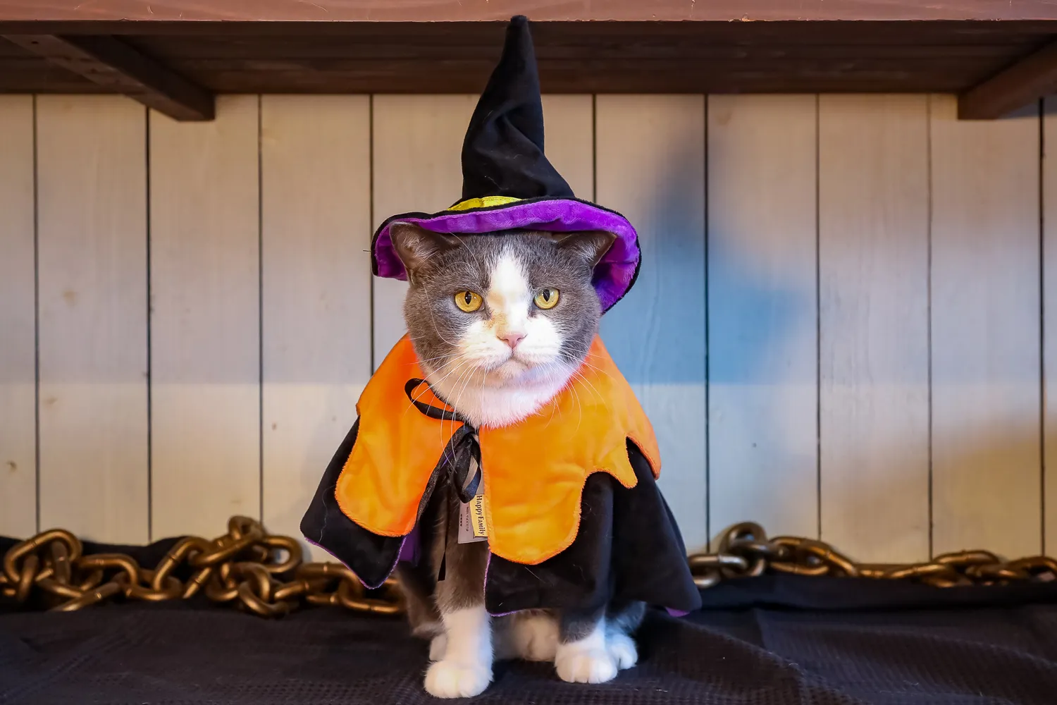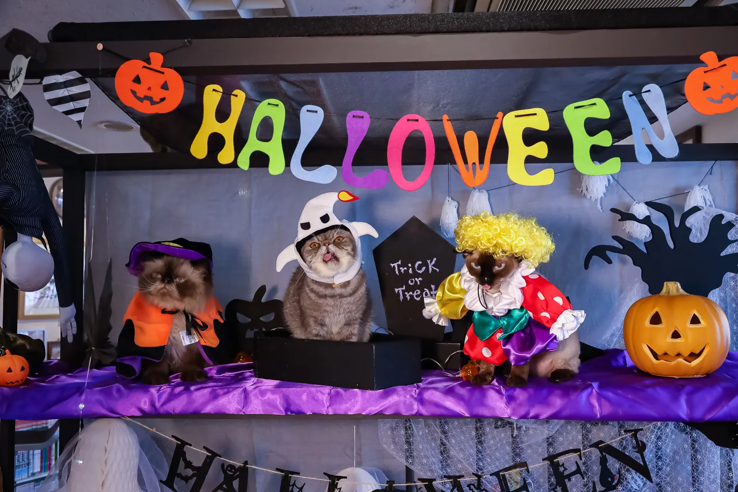 キャンペーン期間中、インテリアはいつもと違うハロウィン仕様のディスプレイとなり、猫さんたちも個性的なコスチュームでお客様をお迎えいたします。18時以降はオレンジの“イルミニャーション”を点灯するなど、この期間にしか出会うことができない限定サービスを、ぜひお楽しみください。