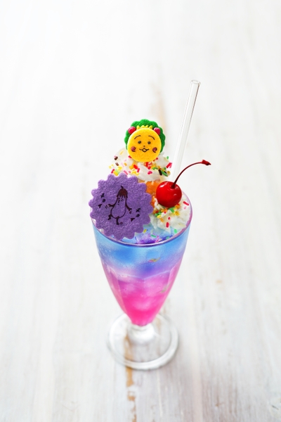 味は爽やかなレモン味。だけど混ぜるとナス色になる不思議なクリームソーダにおたんこなすとコジコジのクッキーをトッピング。