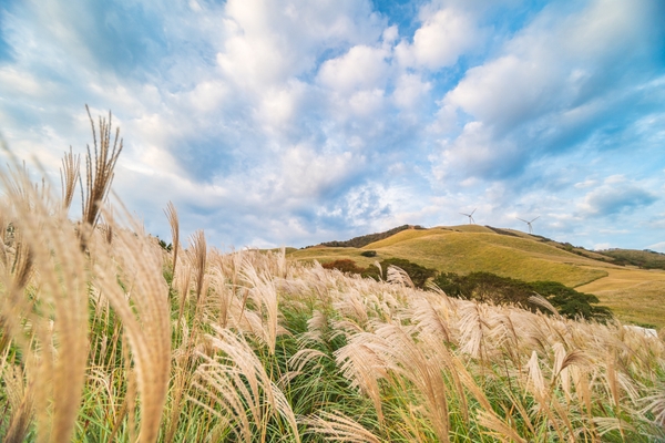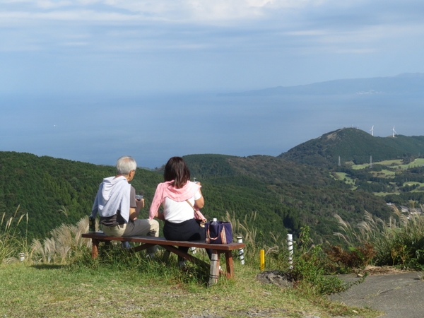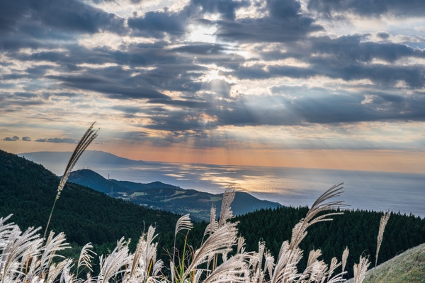 相模灘・伊豆諸島を一望できる絶景・稲取細野高原。毎年秋には、広大なすすき野原と海原を同時に視界に入れて楽しめる「海すすき」の景色を楽しみながら散策できます。