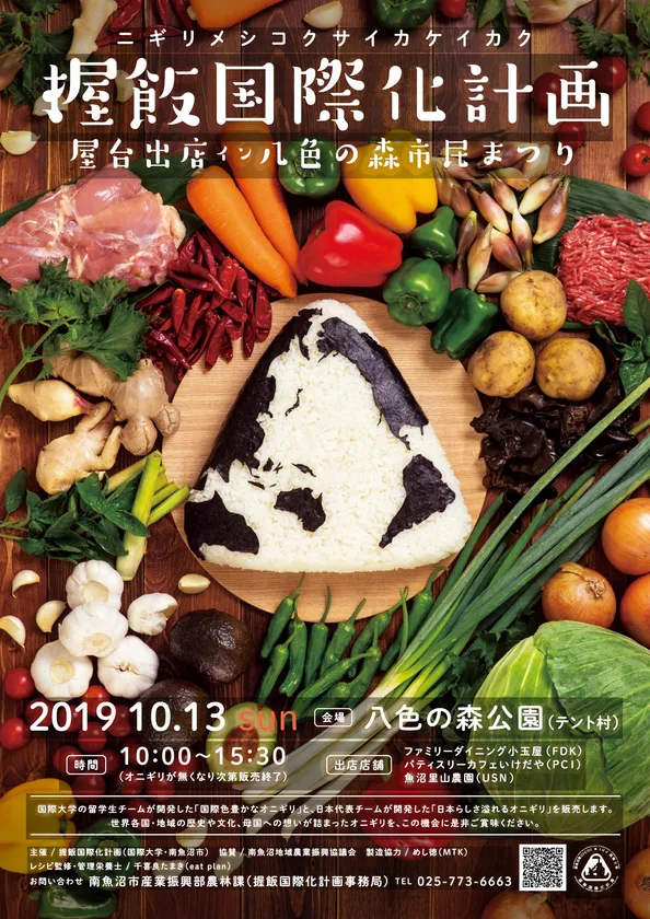 南魚沼市は、国際大学との共催による南魚沼産コシヒカリ販売促進事業「握飯国際化計画(ニギリメシコクサイカケイカク)」の一環として、2019年10月13日(日)に南魚沼市・八色の森公園(八色の森市民まつり)において国際オニギリを販売いたします。