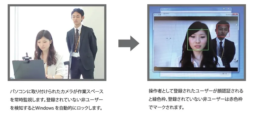 「顔認証のぞき見ブロッカー」は、「画面に表示された情報の保護」に特化した端末インストール型ソフトウェアです。顔認証技術を活用することで、事前登録した人物以外の顔を検知した場合や操作者の不在を検知した場合にパソコン画面をロックします。同時に、操作画面キャプチャ画像、カメラ画像をログとして保存・管理する機能により「のぞき見」や「なりすまし」および「故意」による情報漏洩リスクの低減を図ります。