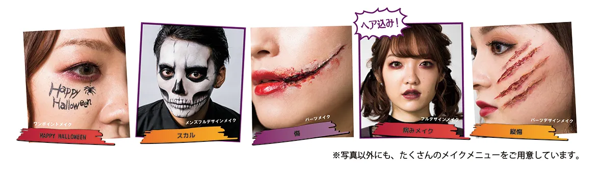毎年大人気の「ハロウィンメイクメニュー」が、今年も10月1日(火)~10月31日(木)までの期間限定でスタートいたします。ハロウィンロゴのワンポイントから、スカルや傷、ガイコツなどの本格的な仮装まで、16種類以上のデザインをご用意しています。今年はカワイイ系のヘアセットとメイクを合わせたメニューもご用意しているので、友達とお揃いでぜひ挑戦してみてください!