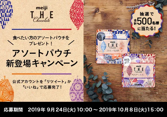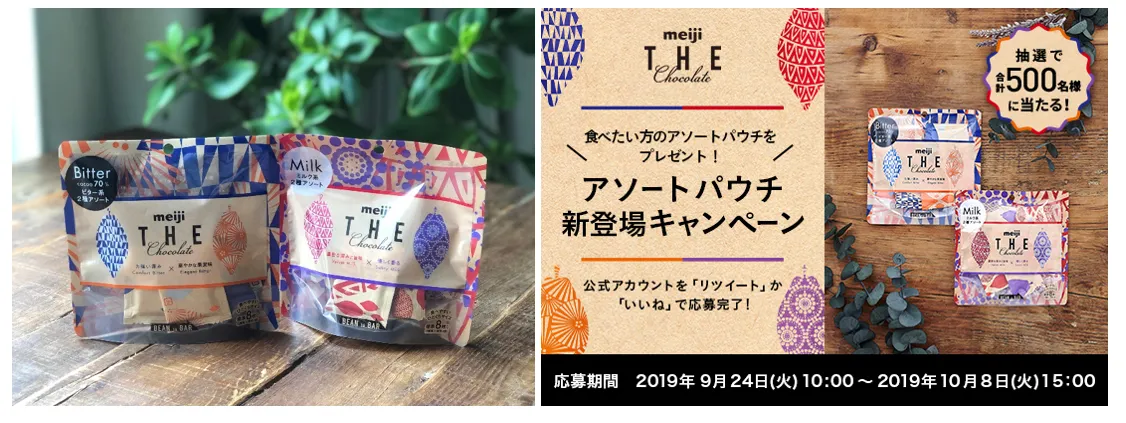 また、新商品発売を記念して、明治 ザ・チョコレートが当たるキャンペーン「アソートパウチ新登場キャンペーン」をTwitter上で実施いたします。本キャンペーンは、新商品「明治 ザ・チョコレート ビターアソートパウチ」と「明治 ザ・チョコレート ミルクアソートパウチ」を、抽選で合計500名様にプレゼントいたします。
