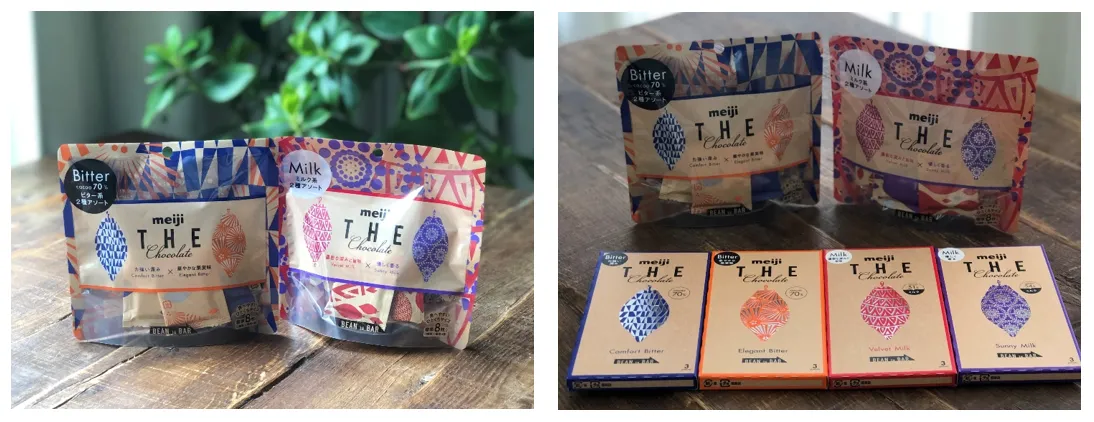 新商品アソートの発売開始に伴い、アソートに含まれる明治 ザ・チョコレート「コンフォートビター」、「エレガントビターー」、「ベルベットミルク」、「サニーミルク」の4種類のお味をリニューアルいたしました。